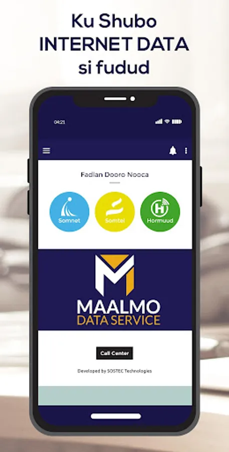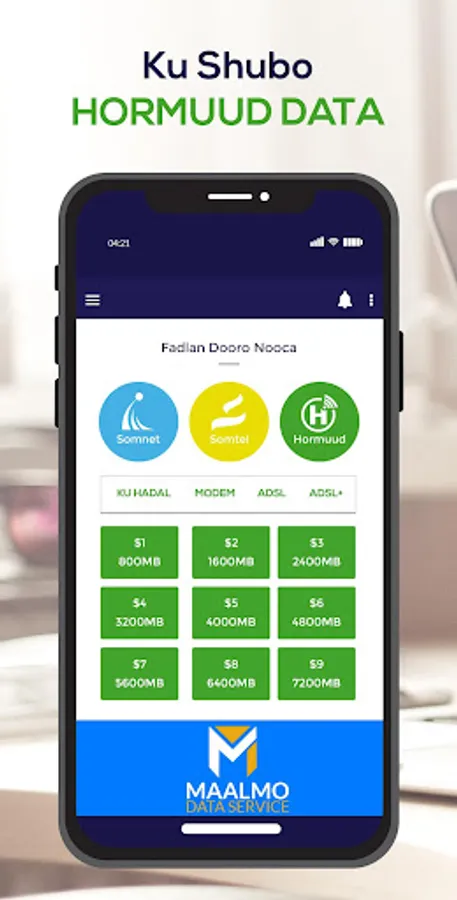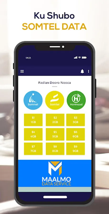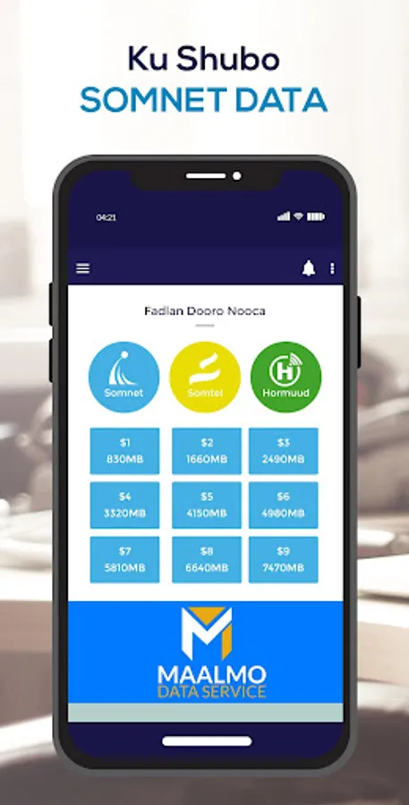 Maalmo Data waa App kuu fududeynaa inaad si fudud ugu shubato xirmooyinka internet ka ee Somnet ,Hormuud iyo Somtel ee bixyaan, adoon wicin qof oo ii soo tuurna oran ayaad si sahlan ku heleysaa xirmo internet ah.