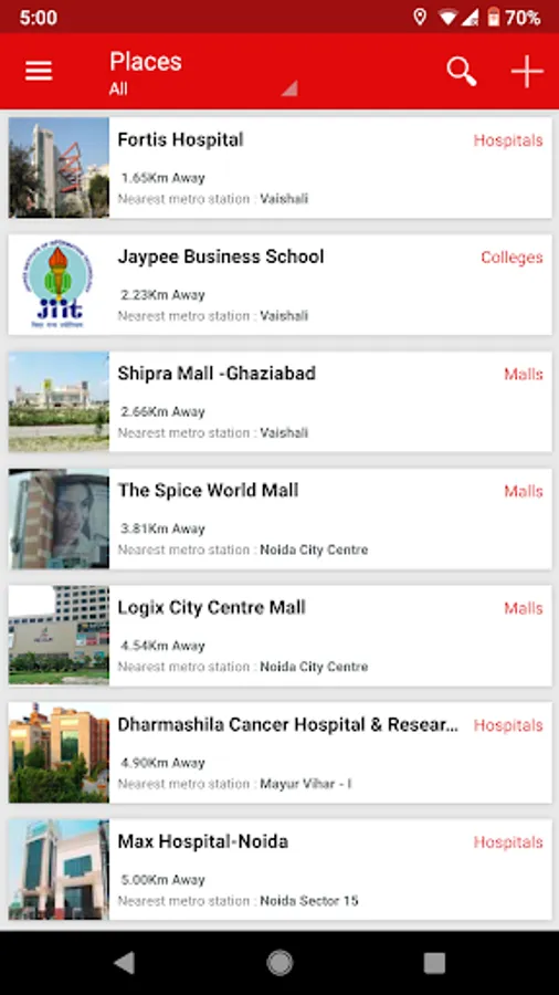 •Categorically segregated list of important places of Delhi e.g. Hospitals, Malls, Tourist & Religious spots.