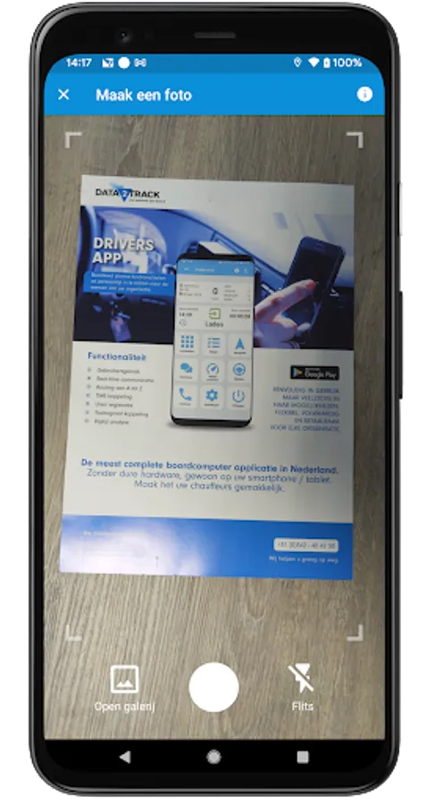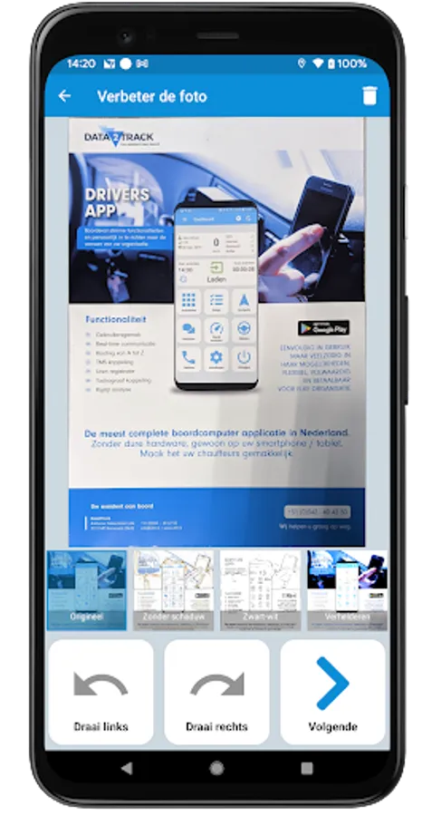 The Data2Track Scan App can be used in addition to the Drivers App to scan documents and improve the quality. The app includes smart logic for document recognition and shadow removal.