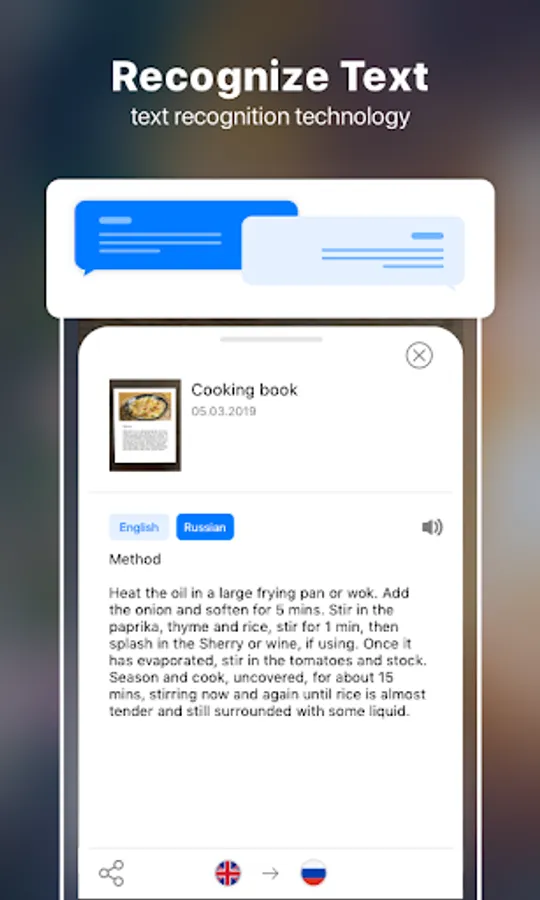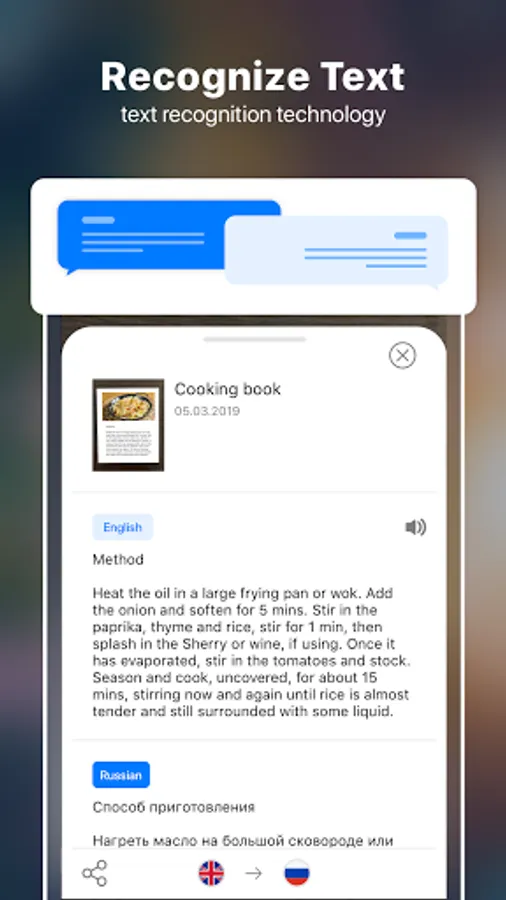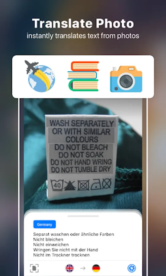 Translate Photo and instantly recognize and translate texts from restaurant menus, magazines, websites, road signs, books etc. Helps those who are traveling abroad and are faced with problems in communication; those who are studying foreign languages, and for those who need a text scanner to work every day with documents in foreign languages.