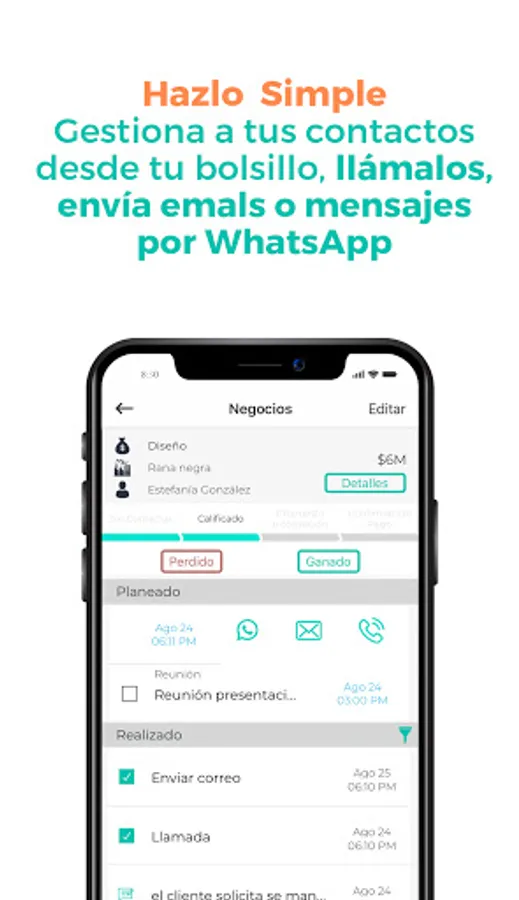 Also, contact your clients through WhatsApp directly from DataCRM Móvil