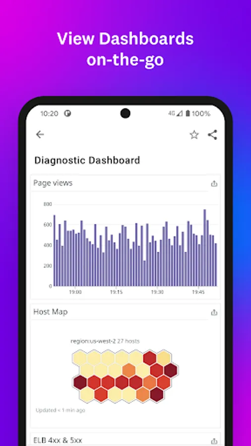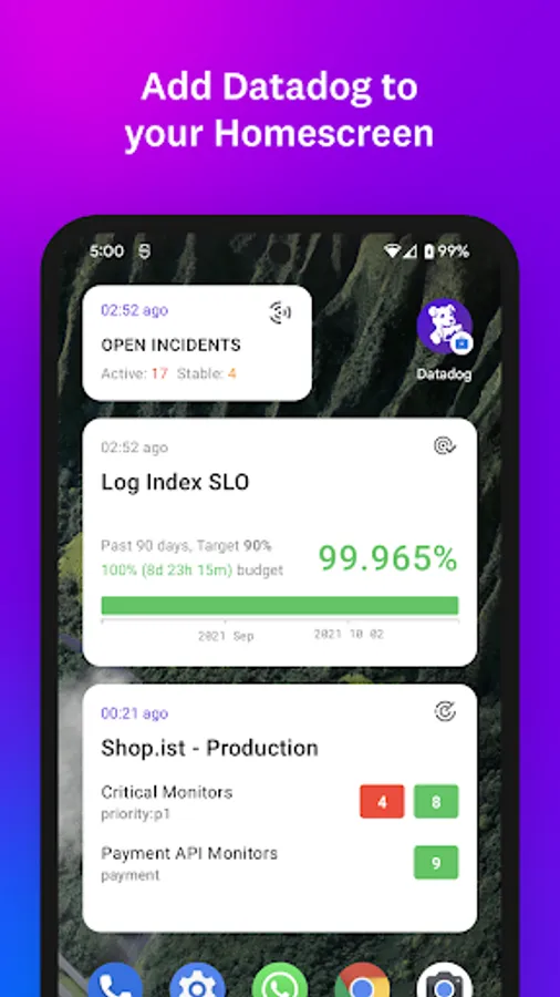 Check the status of your key performance metrics, SLOs, cloud integrations, and more with mobile access to your Datadog dashboards