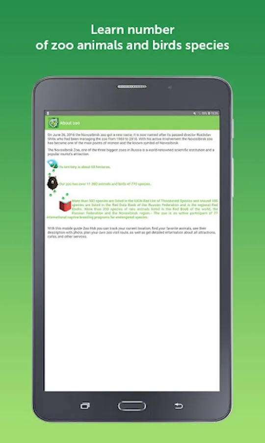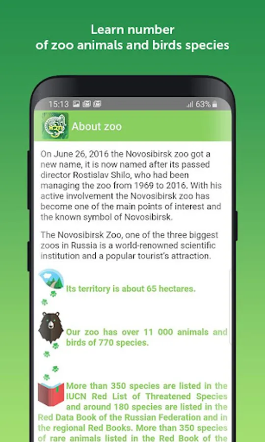 Zoo Nsk is a free mobile application for Rostislav Shilo Novosibirsk zoo, one of the three biggest zoos in Russia. Zoo Nsk is provided to navigate on the zoo territory and to inform visitors about the zoo animals, attractions, working hours, and services. The Zoo Nsk app is a great chance to make your visit to Rostislav Shilo Novosibirsk zoo more interactive and usable. The zoo has over eleven thousand animals from all over the world and is an active participant of different captive breeding programs for endangered species.
