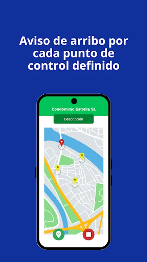 The application allows the security guard to send an arrival notice every time he passes through each checkpoint defined for the round. The notice will be accompanied with date, time and position on the map.