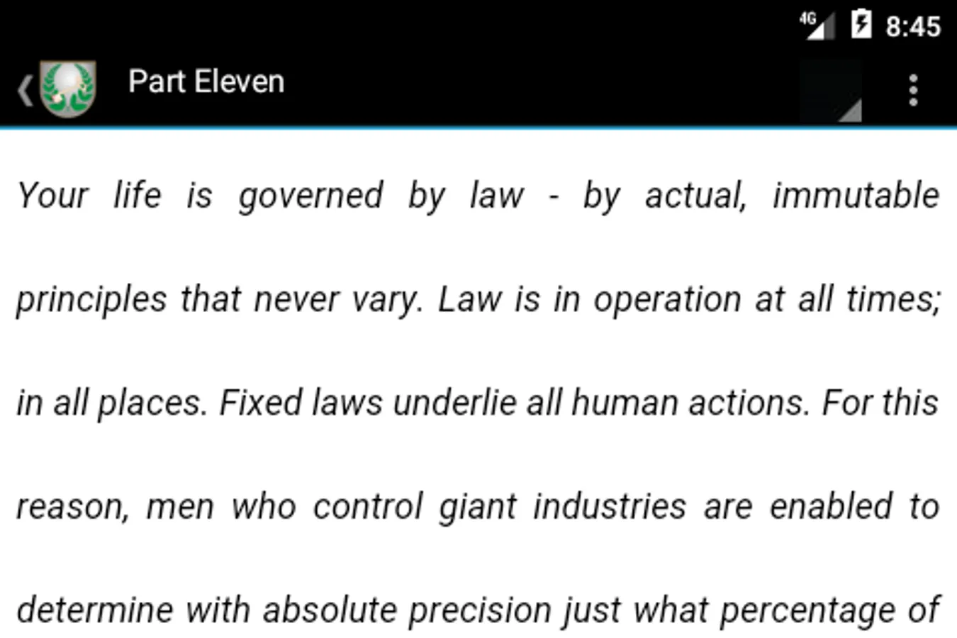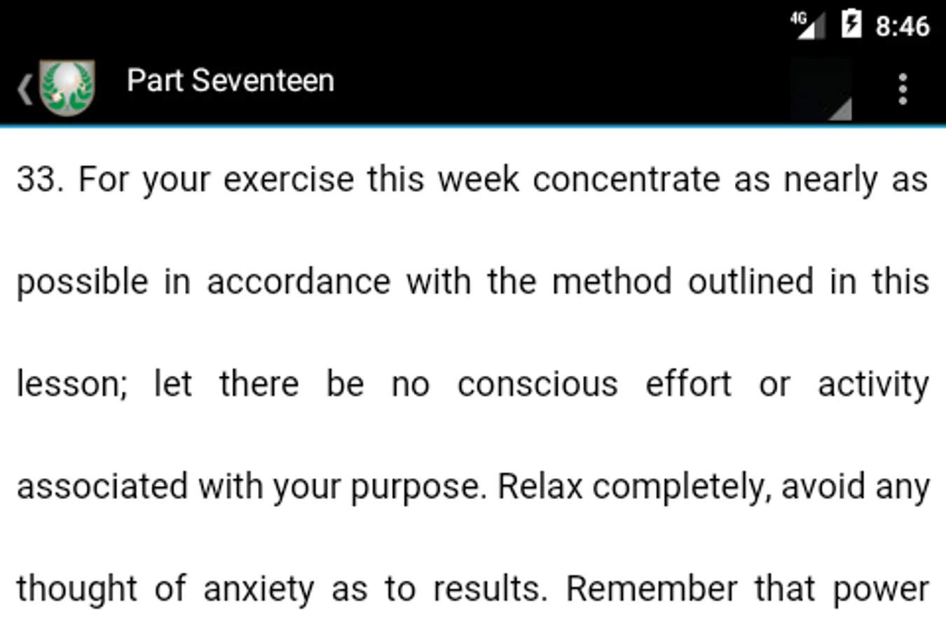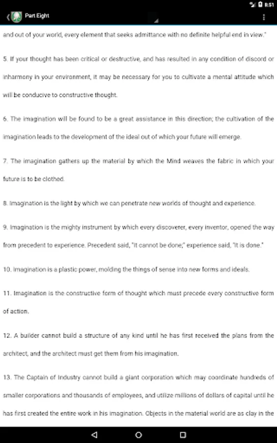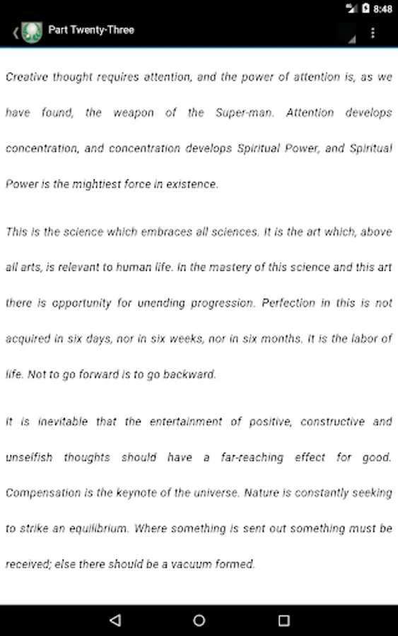 Initially published as a weekly course, its powerful self growth lessons cover skills like visualization, problem solving and will power, in paragraphs full of strong imagery and hints that will help the student assimilate the ideas fast.