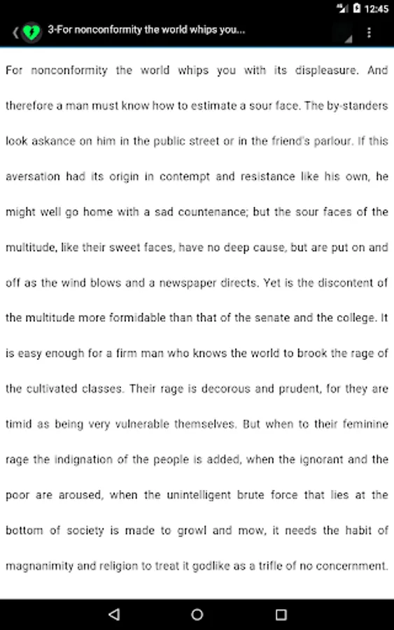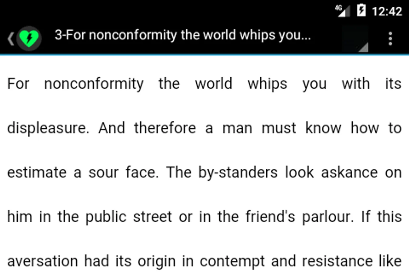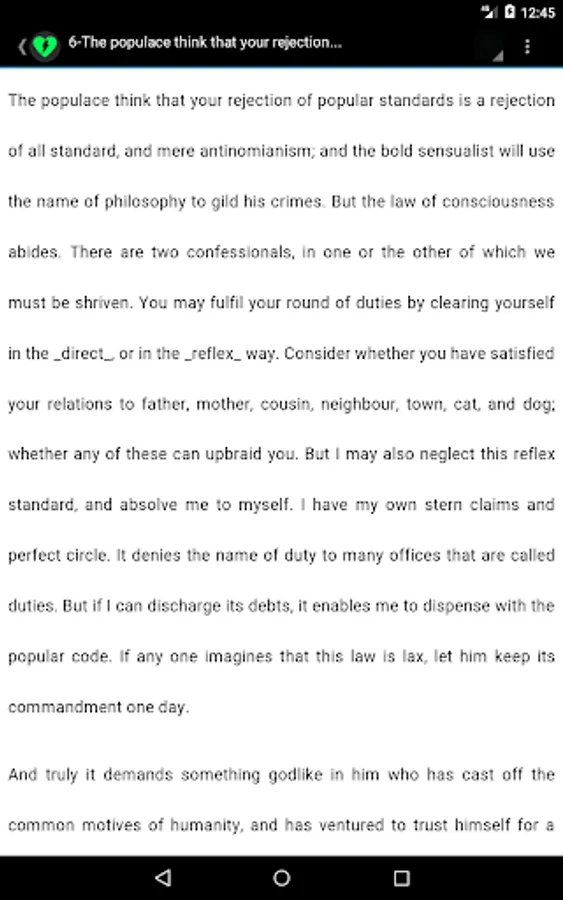 The book discusses matters like building one's character, the dangers of sticking too much to consistency ("the hobgoblin of little minds", as he famously defined), and the existence of a Truth that is different for each person (as opposed to a monolithic, single-version "Truth"); a Truth to which each person is due their full loyalty.