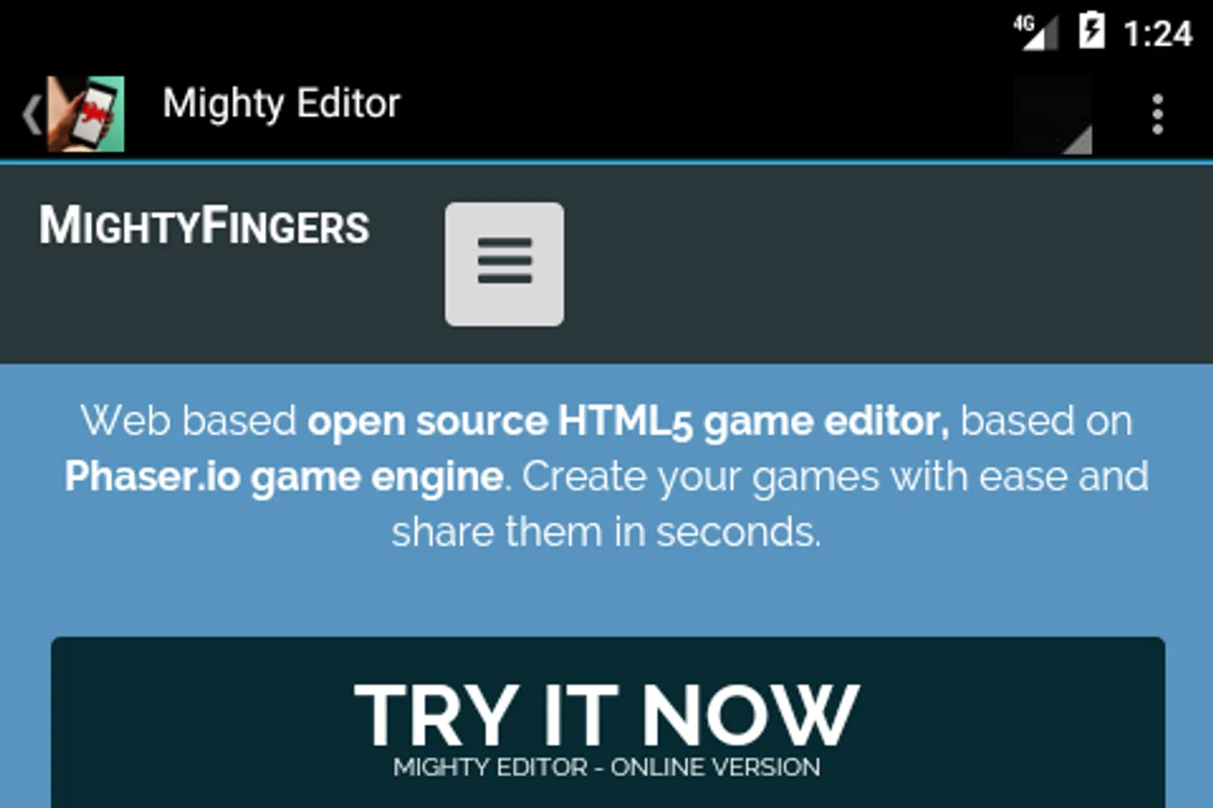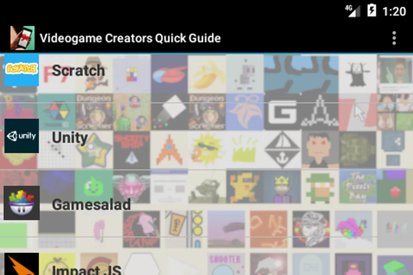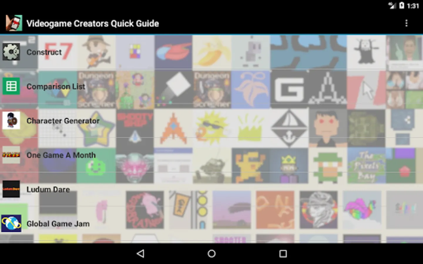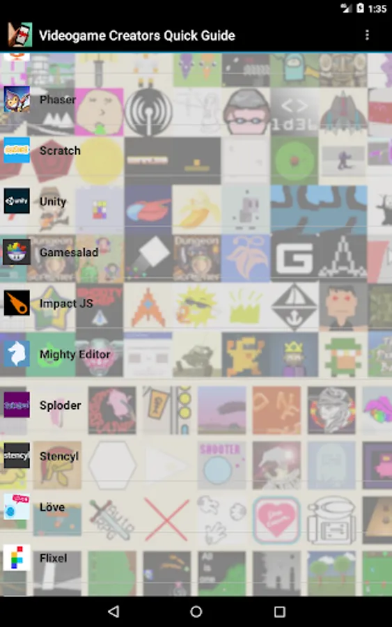 The selection in this app aims at offering a high volume of options, all of them validated by the test of time, quality, and strong supportive communities. There are so many options available for game makers that there is no point in covering them all, but here you will find, side by side, at least one remarkable representative of each of the main options: online vs downloadable; game creating social networks vs more professional, heavy featured oriented systems; programming-based interface vs drag-and-drop or mixed systems. Many of these services are offered free of charge or include free of charge entry level options, and they allow the creation of games for all available platforms, both traditional and mobile.