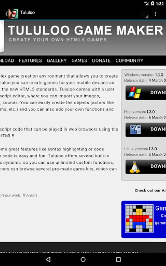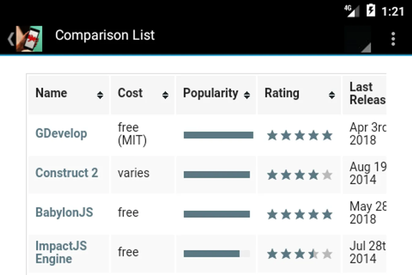 If you're thinking of getting into videogame creation, or you're already initiated and looking to move on to a better platform, this app can help you find which option will better suit your needs, without going through the hours of drudgery of locating and investigating options available. No more Internet hunting for the one or two pieces of relevant information, or trying to guess if a certain service is still "alive" or not.