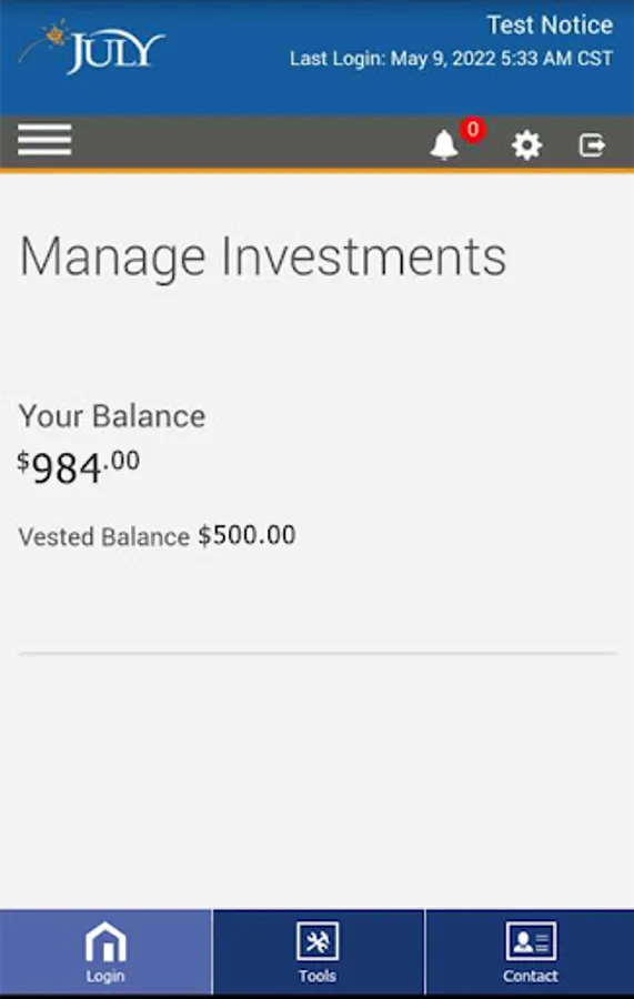The JULY 401k app is provided to help you plan your retirement and view your account when you are away from the office or home. If your plan is on the JULY Retirement Platform, you have access to your plan that will allow you to perform the following functions:
