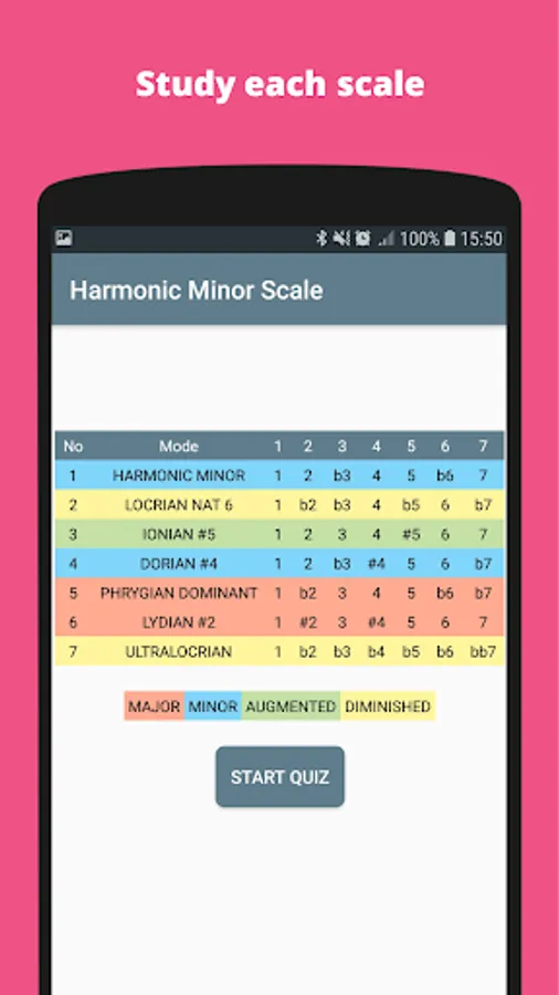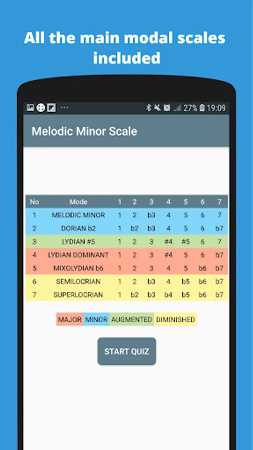 This app is a simple guide and quiz intended to help you become familiar with the most commonly used modal scales in jazz and classical music. The main diatonic scales are included. These are the Major, Harmonic Minor, Harmonic Major and Melodic Minor scales.