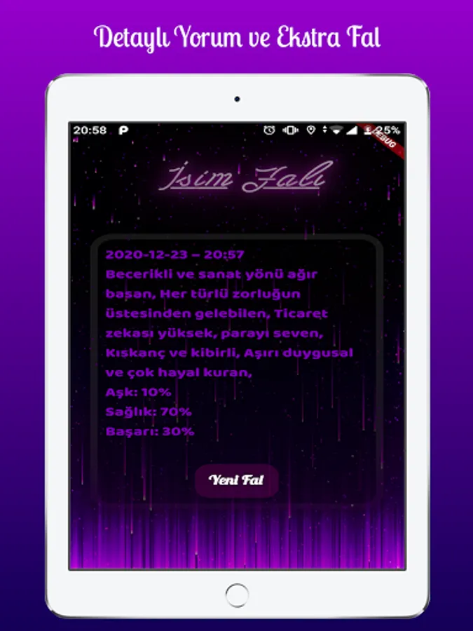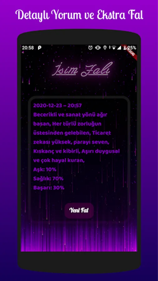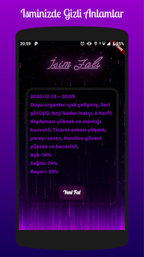 Size özel isim falınızı öğrenin. Kişilik özelliklerinizi, burç özelliklerinizi bu fal programı sayesinde görebilirsiniz. Bu uygulamadan edineceğiniz tavsiyeler isminizin gerçek anlamini ögrenmenizi sağlar.