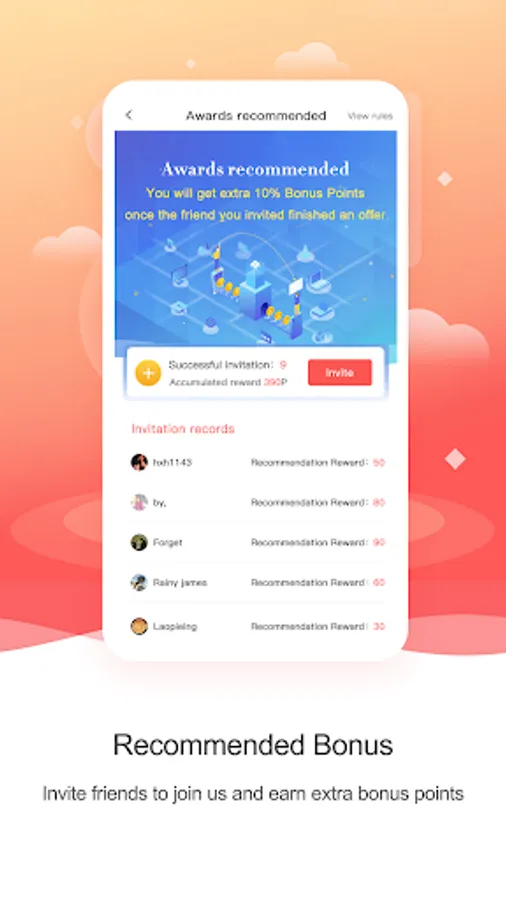 Recommendation award. Invite your friends to join DataRolls, you can enjoy and happiness of sharing and also earn more bonus Points!