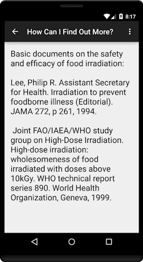 Food Irradiation is a promising new food safety technology that can eliminate disease-causing germs from foods. Download this app and find out more!