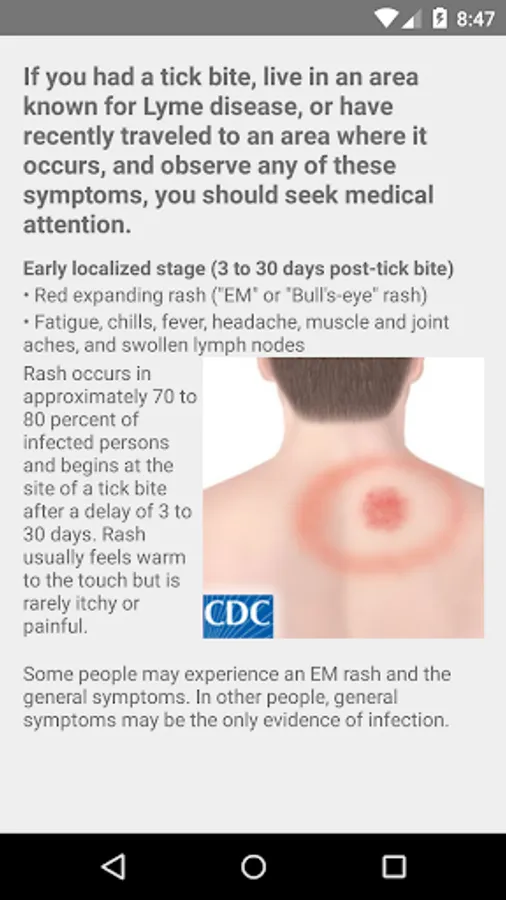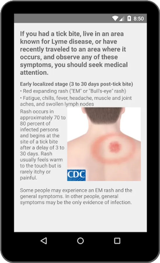 This app cannot and should not replace a doctor consultation. App content is only for pocket reference & educational purposes only. Consult a doctor if you believe you have contracted Lyme disease.