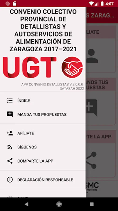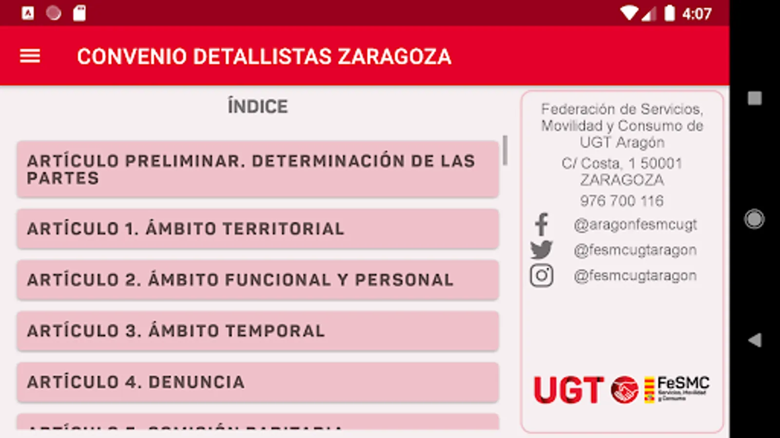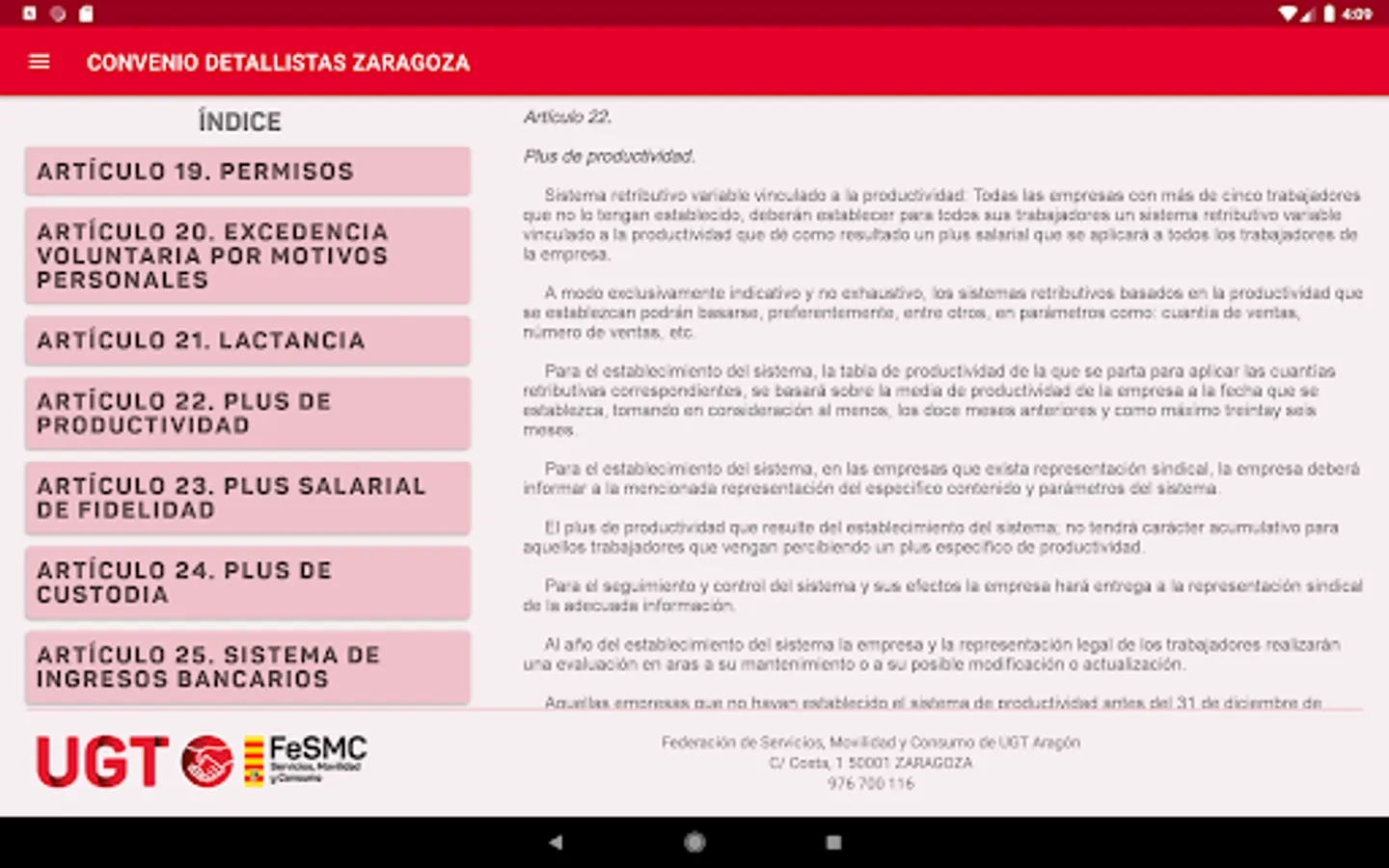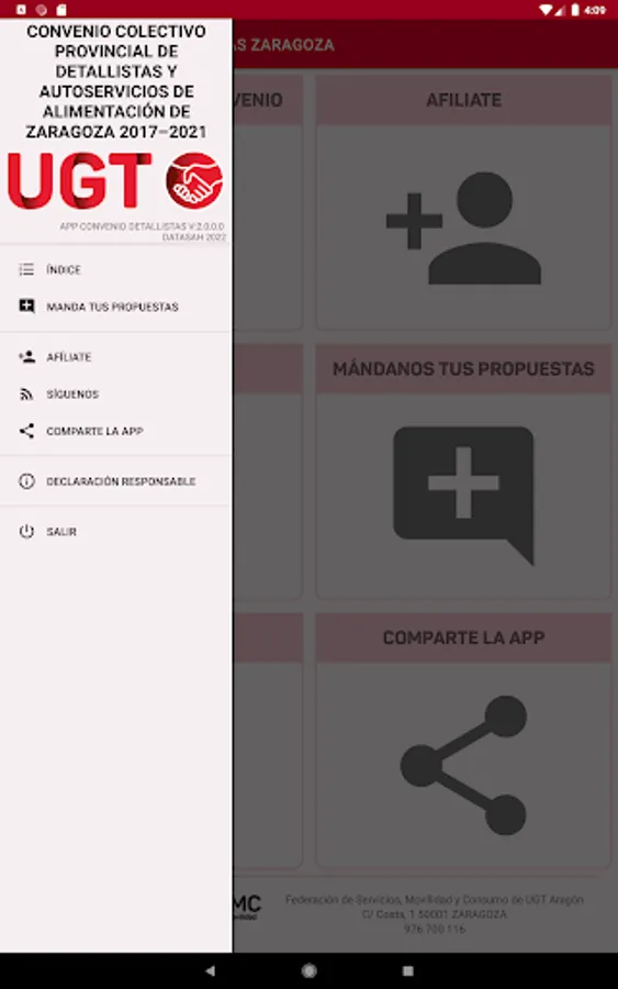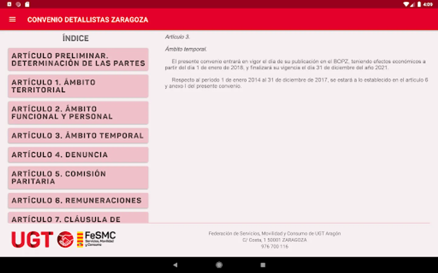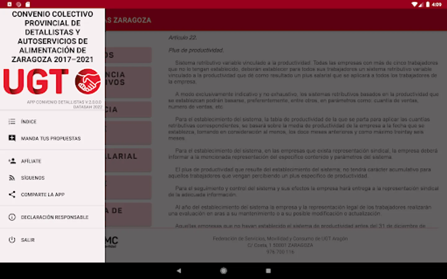 App created by Datasah for UGT Fesmc Aragón, which reproduces the text of the PROVINCIAL COLLECTIVE AGREEMENT FOR THE RETAIL AND SELF-SERVICE FOOD SECTOR OF ZARAGOZA, published in the Official Gazette of the province of (No. 214, of September 16, 2020) .