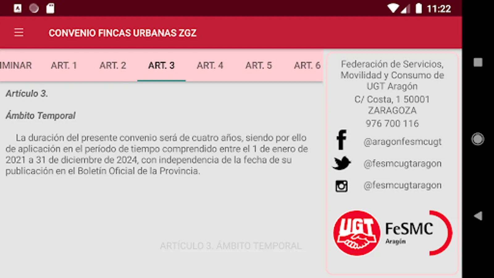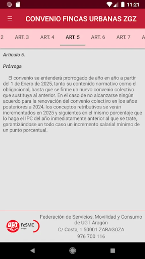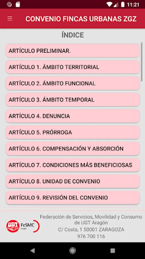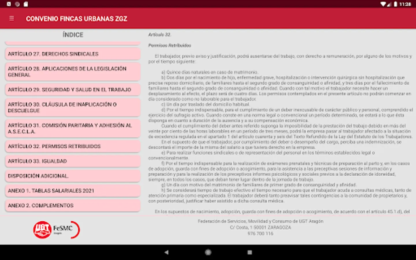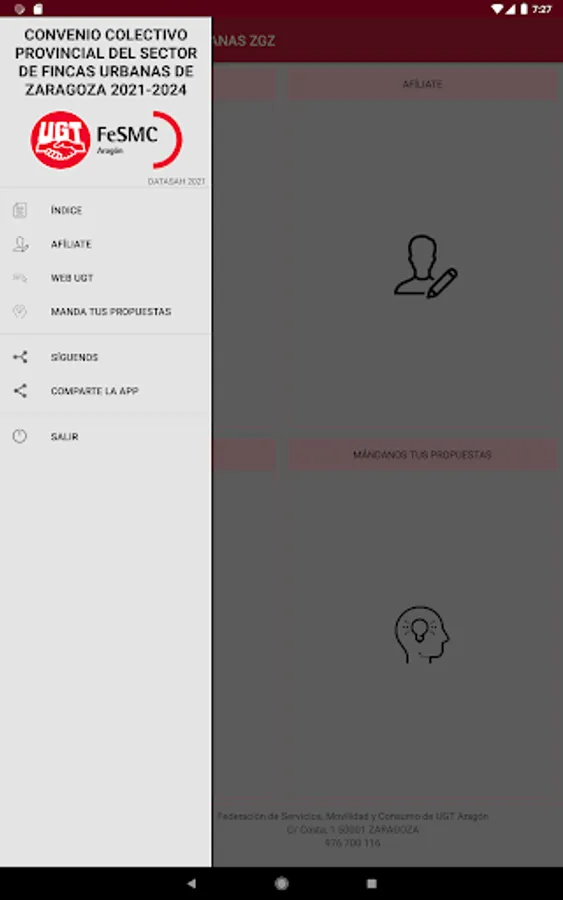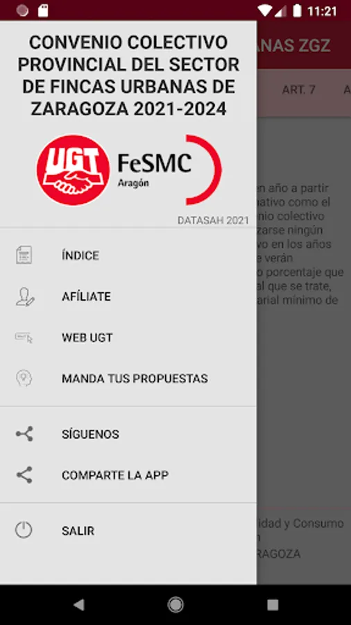App created by Datasah for UGT Fesmc Aragón, which reproduces the text of the Collective Agreement for the Zaragoza Urban Farms sector 2021-2024, published in the Official Gazette of the province of Zaragoza (no. 193, of August 24, 2021) .