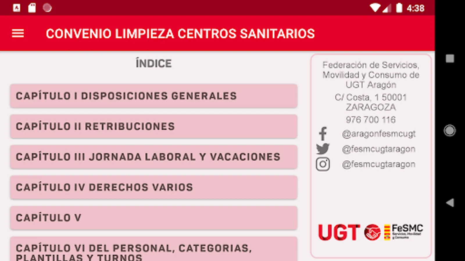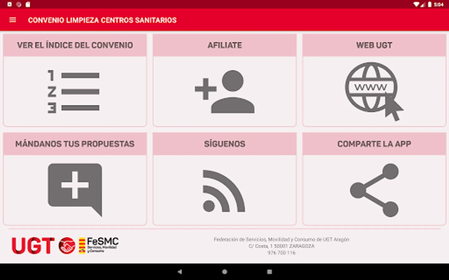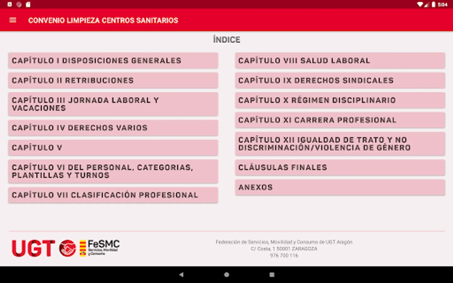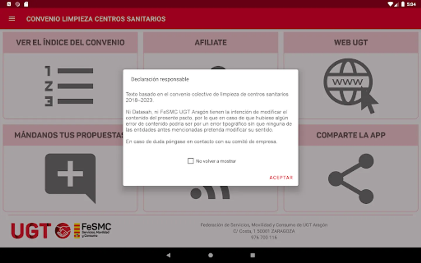 App created by Datasah for UGT Fesmc Aragón, which reproduces the text of the Collective Agreement for cleaning health centers in Aragón 2018-2023, published in the Official Gazette of Aragón (no. 88, of May 10, 2022).