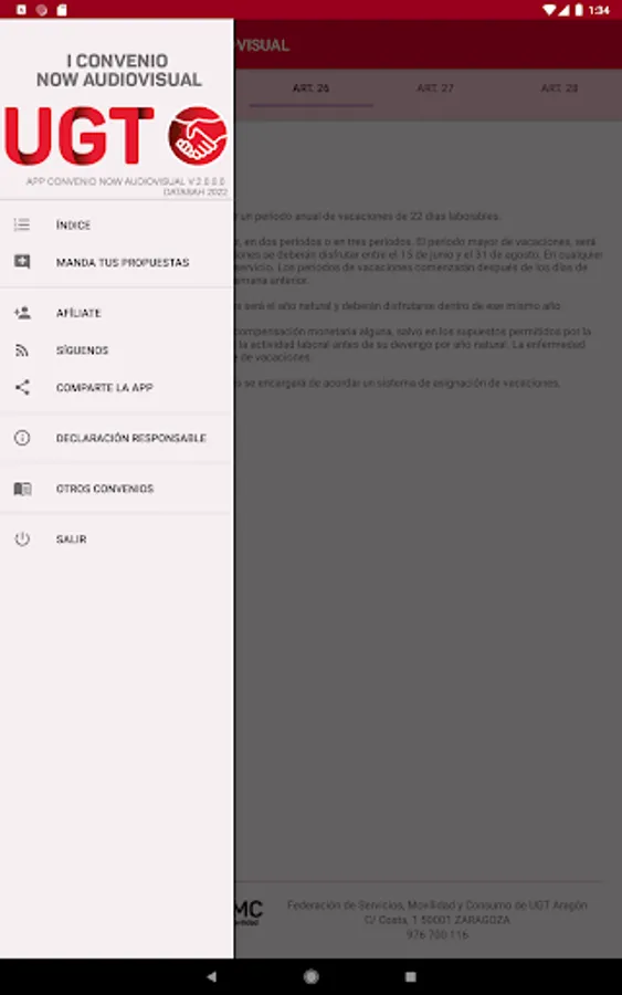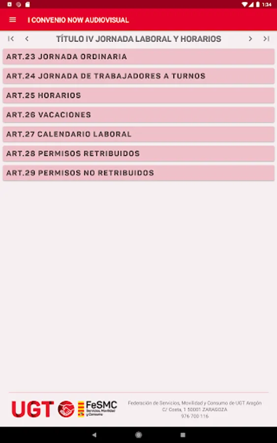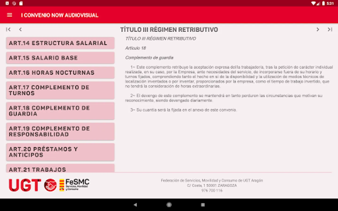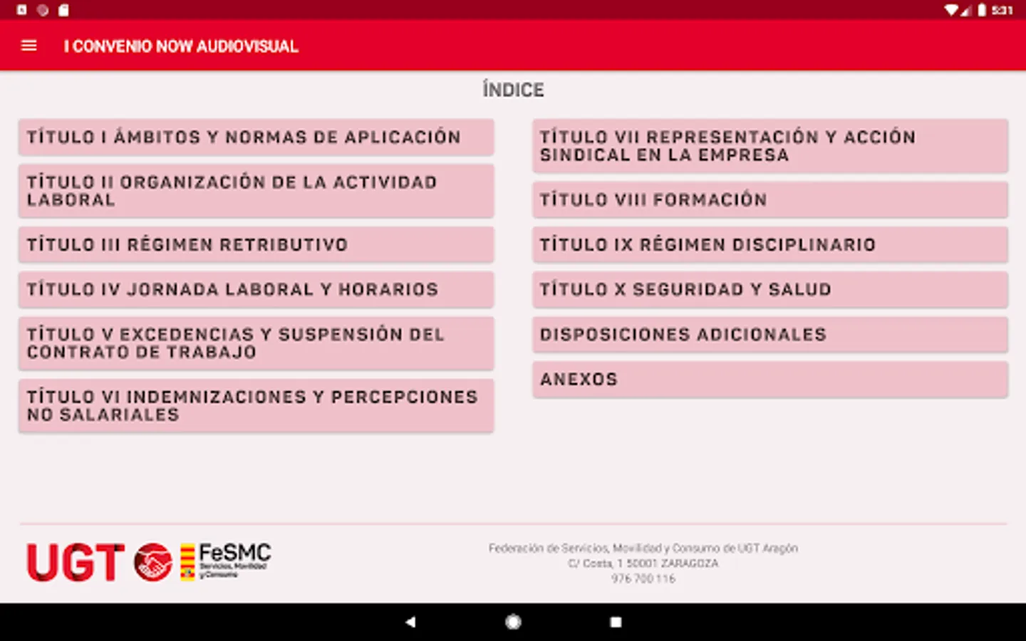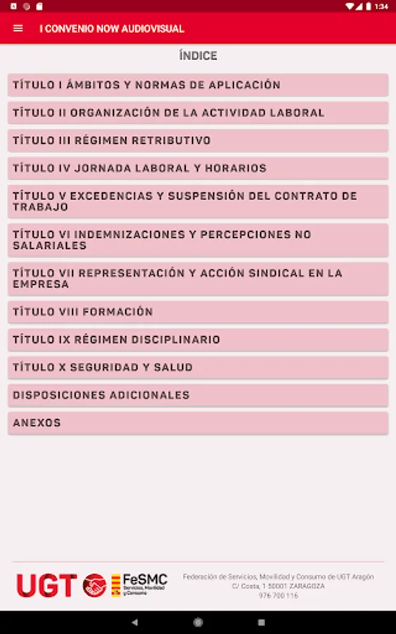 App created by Datasah for UGT Fesmc Aragón, which reproduces the text of the Now Audiovisual Collective Agreement.