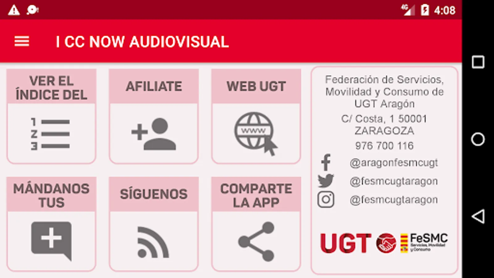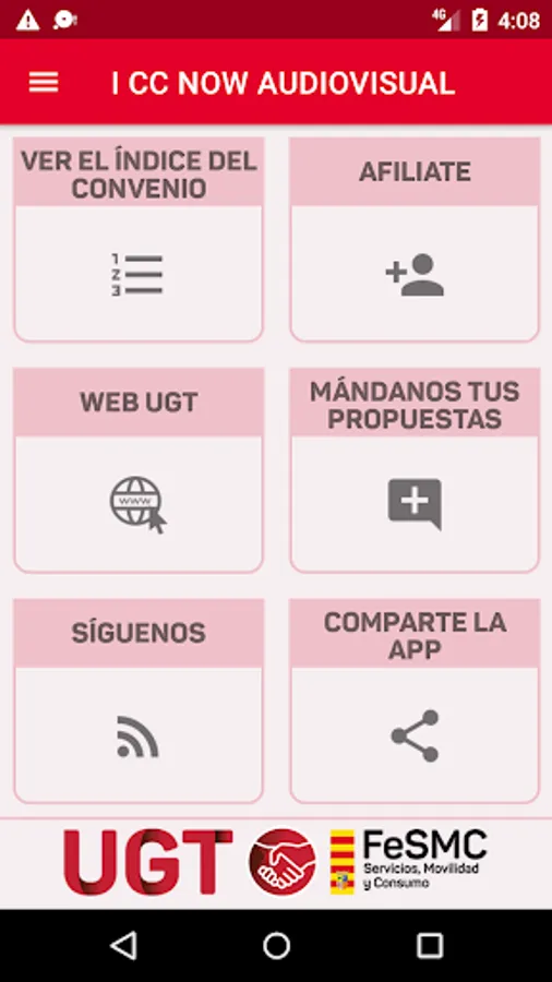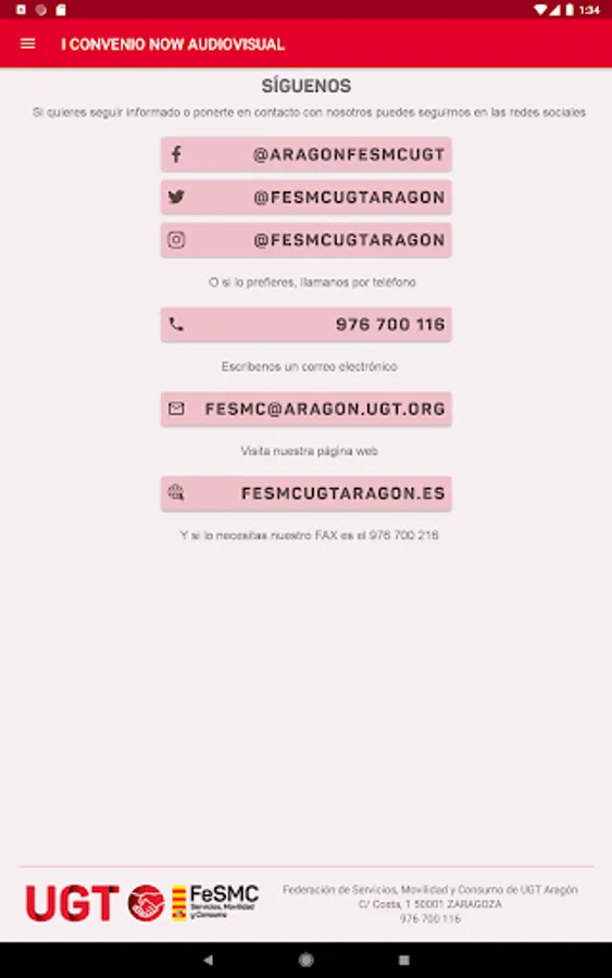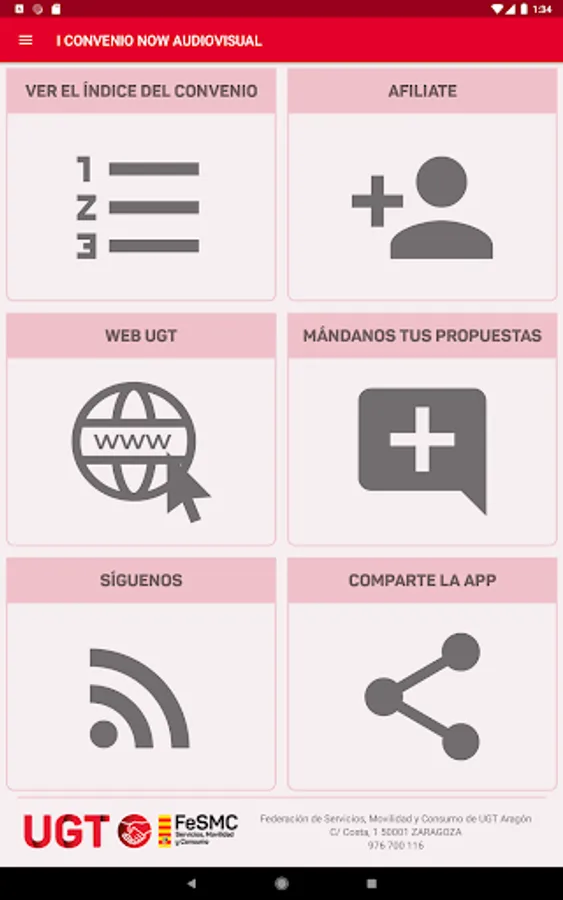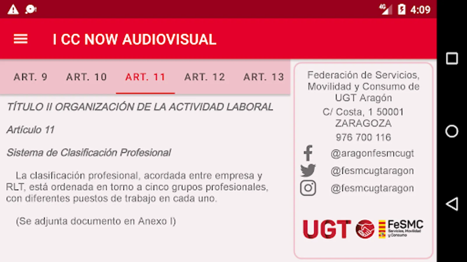 App created by Datasah for UGT Fesmc Aragón, which reproduces the text of the Now Audiovisual Collective Agreement.