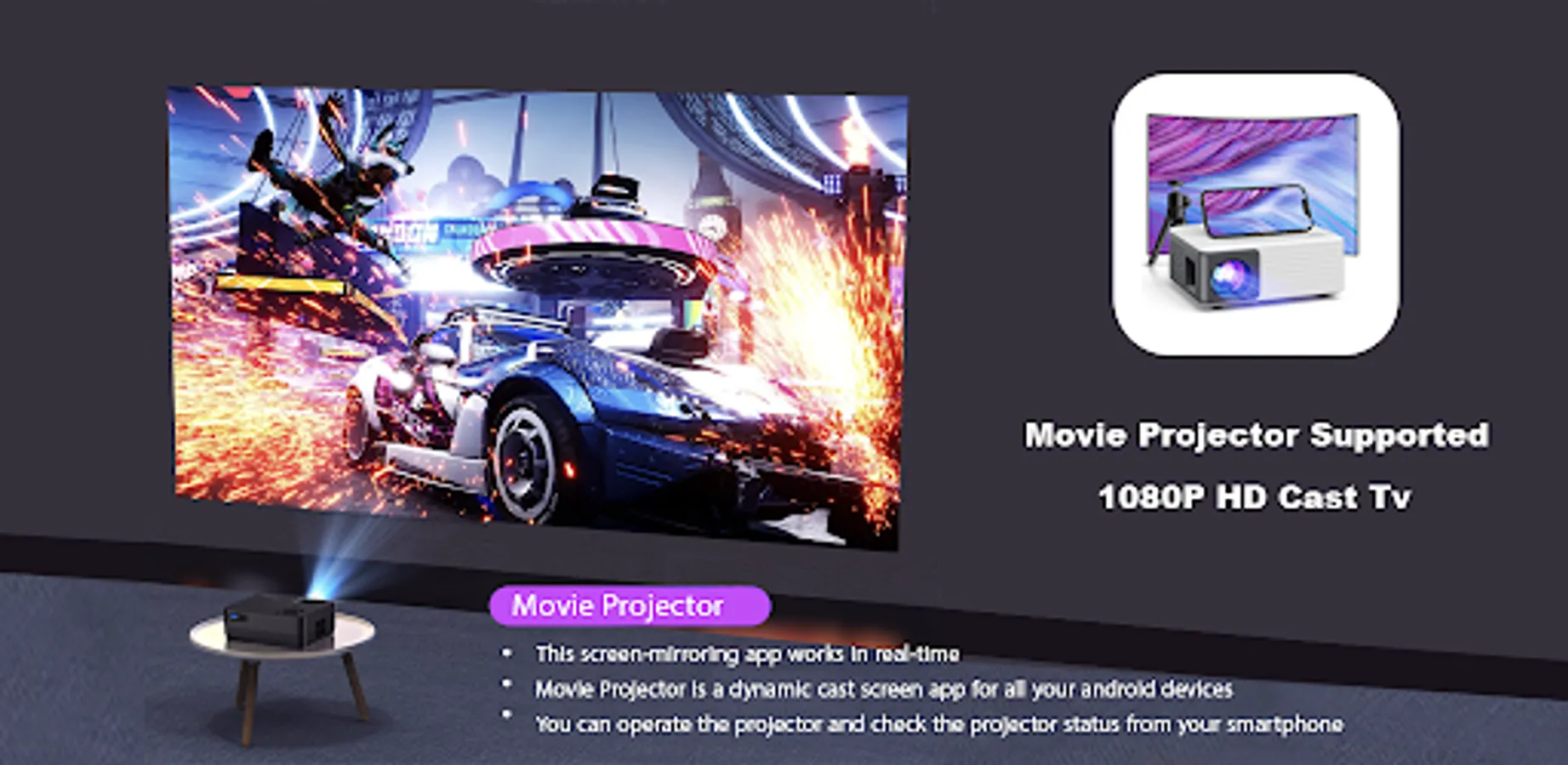 HD Movie Projector is a mobile screen mirroring app that lets you mirror your phone screen on your Smart TV in high-quality and easily share files directly. With this app, you can cast your music, local photos/videos and online videos on the smart TV. You can also watch your favorite TV shows, live streams and play games on the big screen, and screen mirror your mobile device to your Home TV and access the device notifications while using Projector HD Simulator.