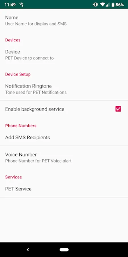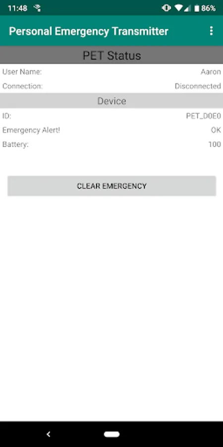 This application connects to a Personal Emergency Transmitter (PET) device. The PET device is a battery powered remote device that can be used to trigger an emergency, which triggers automatic sending of text message alerts containing the user's location, and can automatically trigger a phone call. The PET device is required to use this application.
