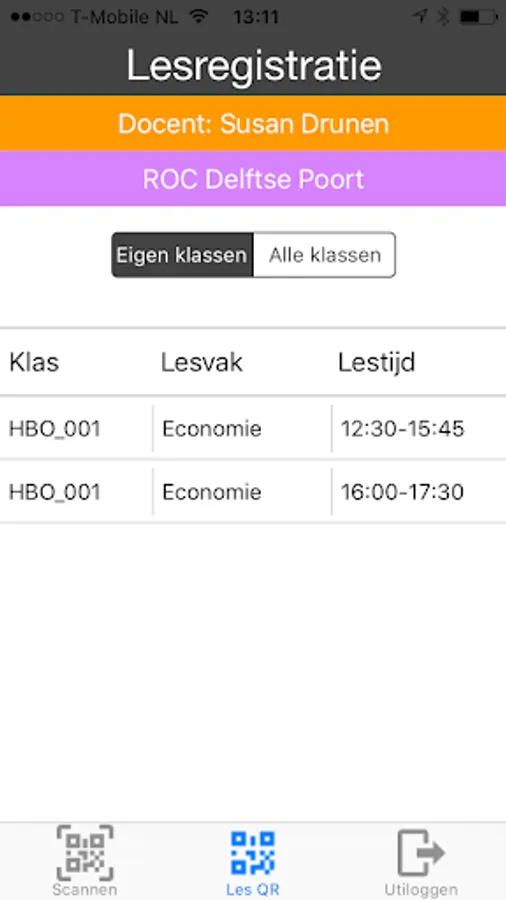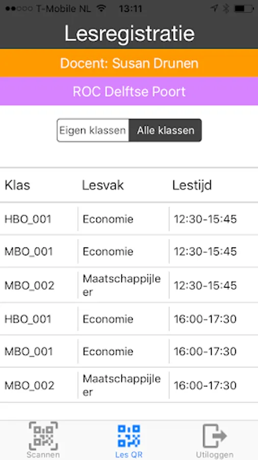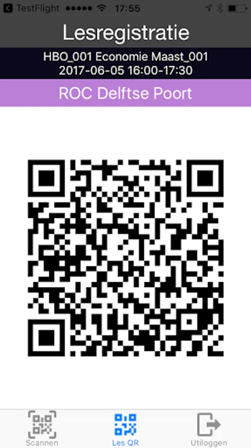 Methode 1: De docent kan een een les selecteren, waarna het selecteren van de les er een unieke QR code van deze les zal worden gegeneerd en worden weergegeven op het scherm van de smartphone of tablet. De student opent het scanscherm op zijn/haar smartphone en scant de QR code om zijn/haar aanwezigheid voor in deze les te registreren.