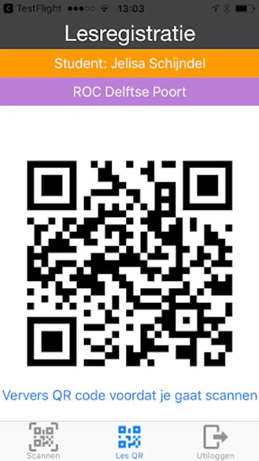 Methode 2: De student opent op zijn/haar smartphone vanuit de app, het scherm 'registreren' waarna er een unieke QR code van deze student zal worden gegeneerd en worden weergegeven op het scherm van de smartphone. De docent opent het scanscherm op zijn/haar smartphone of tablet. De student kan de QR code voor het scanscherm houden om zijn/haar aanwezigheid voor in deze les te registreren. Door het random meerdere malen per uur opnieuw laten genereren van een unieke QR code, is kopieren nagenoeg uit te sluiten.