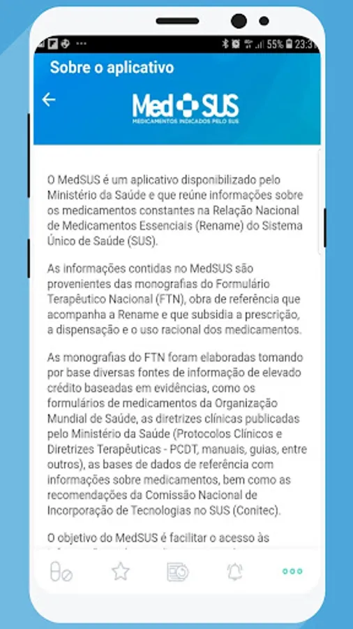 MedSUS is an application made available by the Ministry of Health and which gathers information about the medicines contained in the National List of Essential Medicines (Rename) of the Unified Health System (SUS).