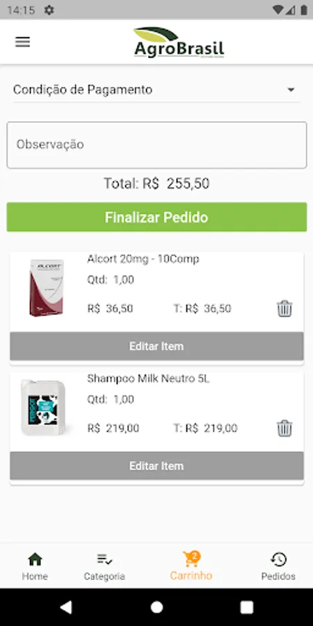 To use the application, customers of the AgroBrasil company will receive a login and password provided by the company. After logging in, the user will be able to view the products and prices, then the user will be able to add the desired products to the cart, then just select the payment option and finalize the order. The order will be sent to the AgroBarsil server or the processing and delivery of the products will be carried out.