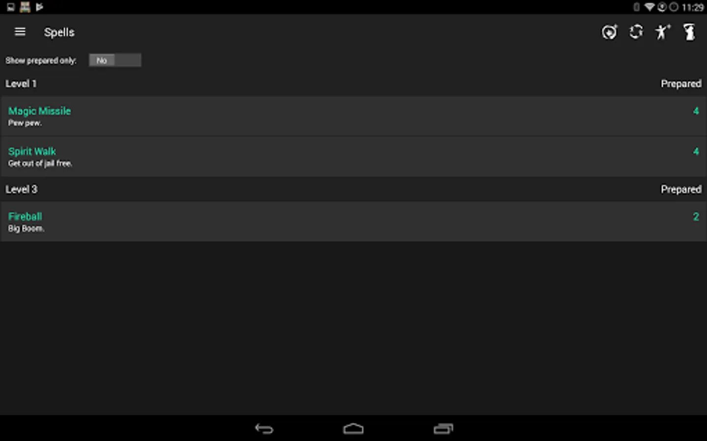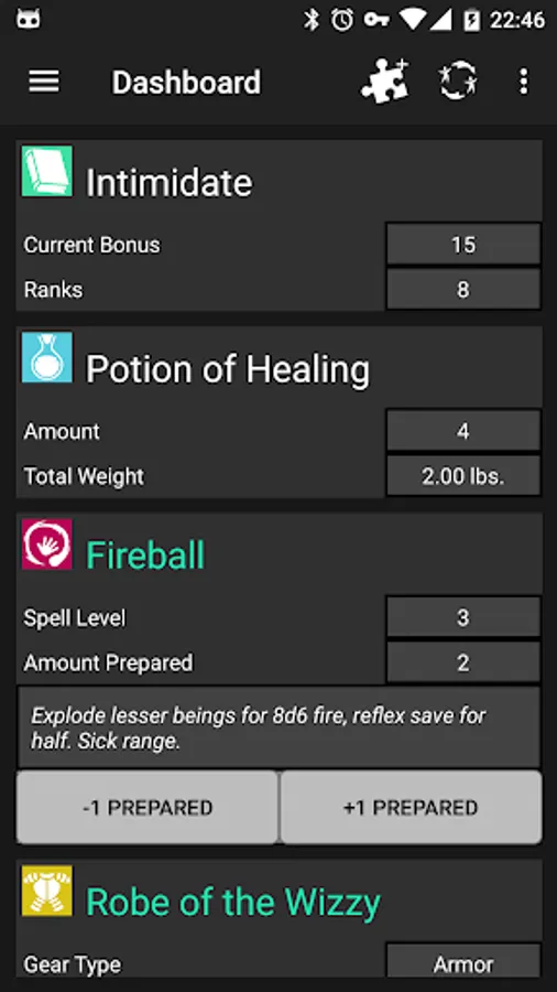 But there's more: You can customize this dashboard by creating more widgets that are based on the information you entered about your character. Widgets that show your skill in Acrobatics, ones that show your weapons and armors, how many of a spell preparation you have left, and much more.