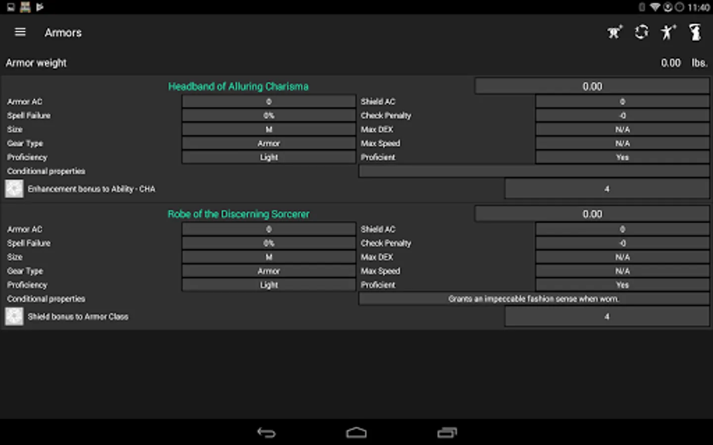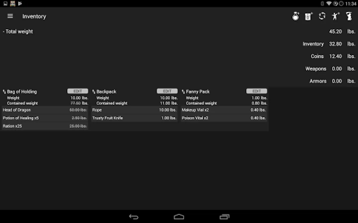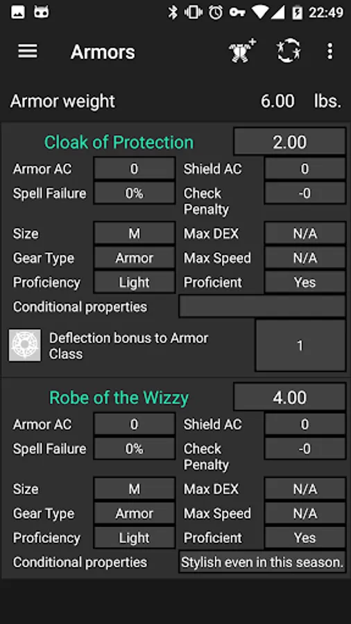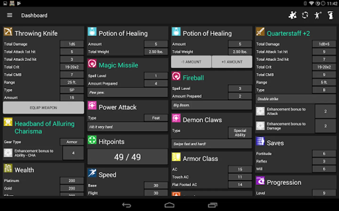 This app lets you manage everything about your character, like their abilities, characteristics, inventory, weapons, armors, skills, combat stats, spells, wealth, and so on.