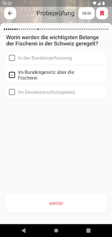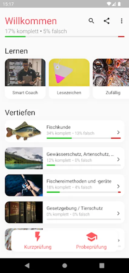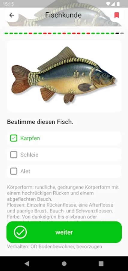 With an easy-to-use interface and a wealth of features, this app is specifically designed to help you prepare for your fishing license exam. The app contains comprehensive learning content, exam questions, quizzes, practical tips and much more to deepen your knowledge of the fishing exam and the applicable regulations in Switzerland. You can test and improve your knowledge in different categories such as fish species, hydrology, environmental protection, legislation and techniques.