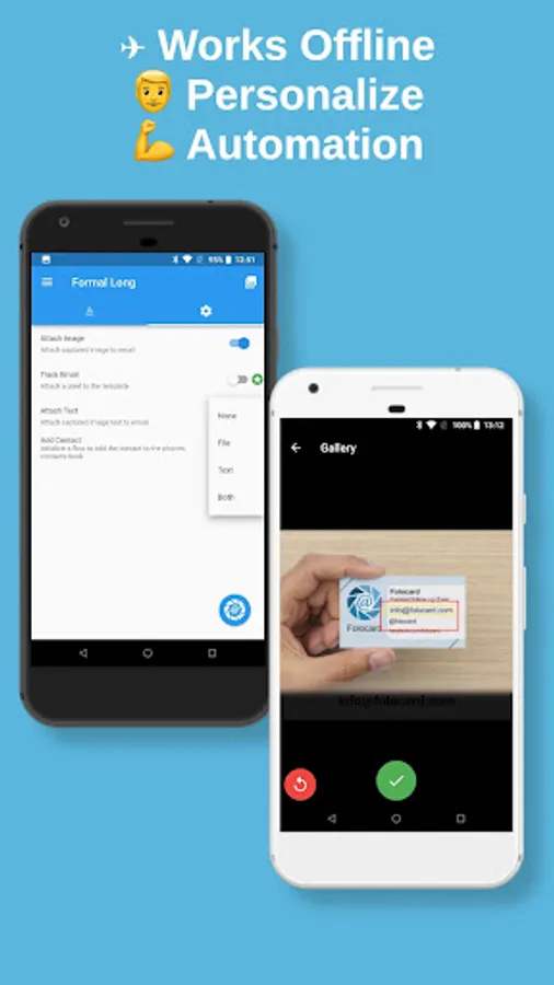 * OFFLINE: No WiFI/Cellular reception at a conference? no problem. The AI model (OCR) recognizes LATIN. Enabled Airplane mode? Pull out those biz cards to complete your follow-ups before you land. Emails will be queued. VPN friendly.