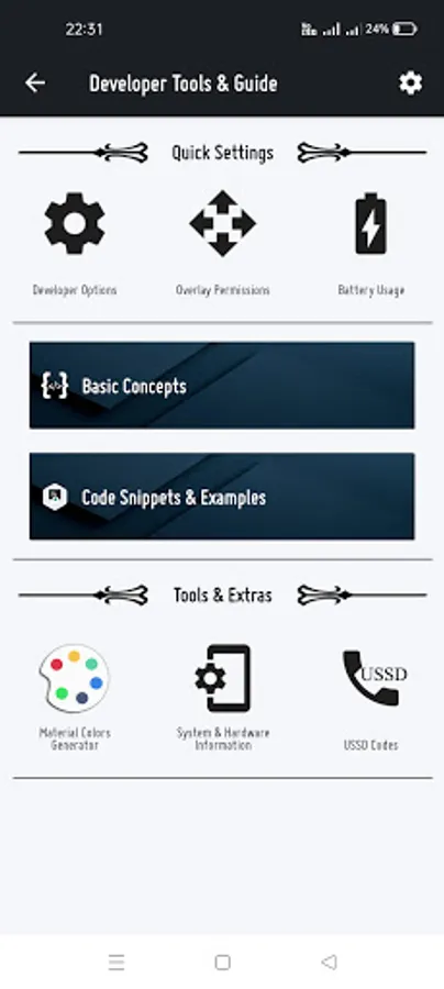 App provide easy access to hidden settings, that is very useful for android developers.