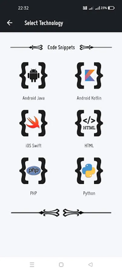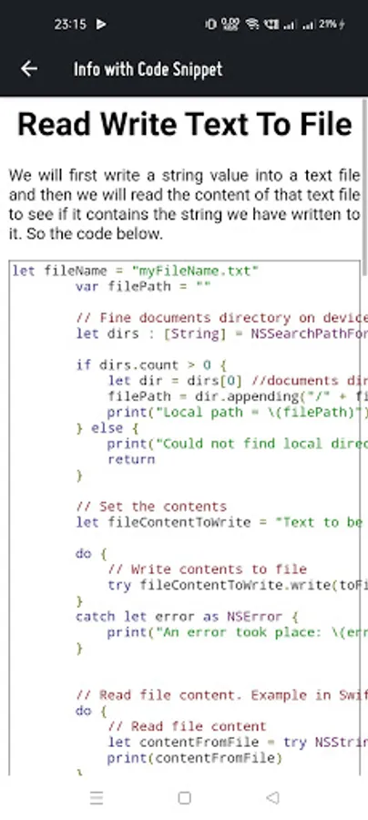 App contains java code snippets for android development, and Swift code snippets for iOS app development.
