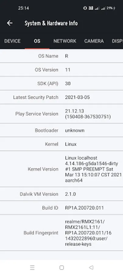 Major tabs : device , os , display , camera , network using these you can easily check all details of your device. e.g. cpu architecture , os version , Latest Security patch , play service version , sim number , camera resolutions , GPU info and much more.