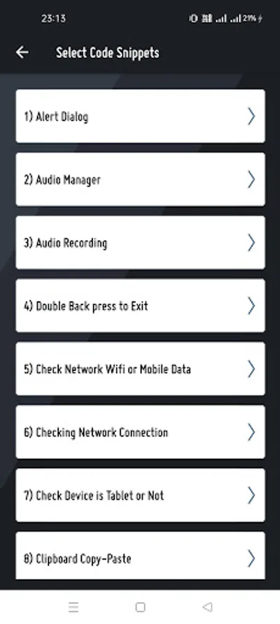 Added New Section for Android Basic Concepts & Add below code Snippets :