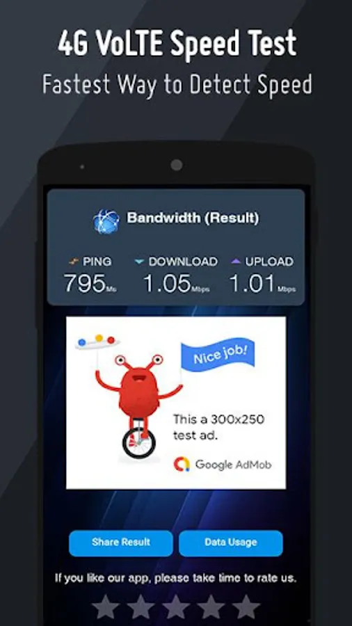 VoLTE Speed Test is a simple and superfast free internet speed tester app. It will help you test internet speed of wide range of mobile networks (3G, 4G, Wi-Fi, GPRS, WAP, LTE), check connection status over the time and monitor data usage. Perform an expert internet speed test with one tap and get all the information about your connection using our app.