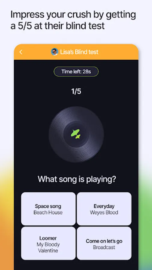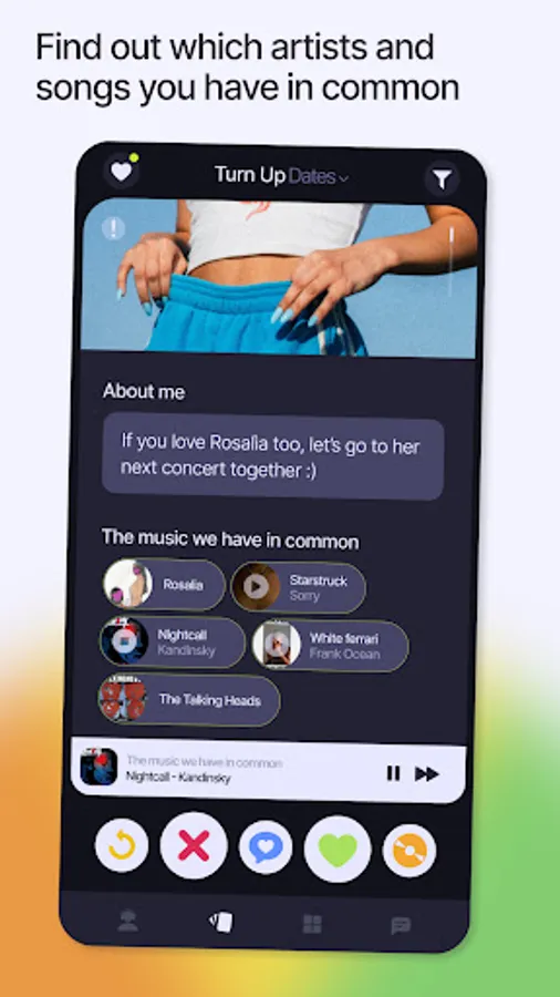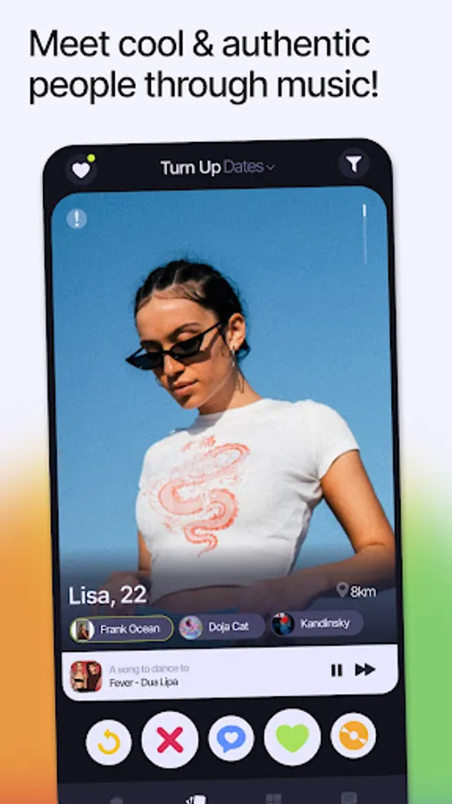Whether you're looking for love or new friends, you can meet them on Turn Up (“dates” mode or “friends” mode), and make unlimited blind tests!