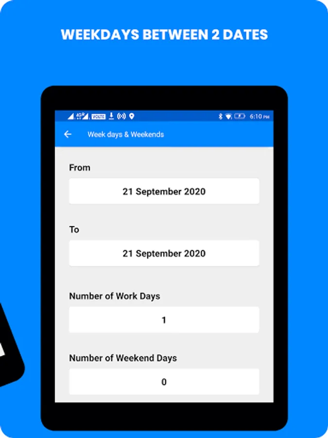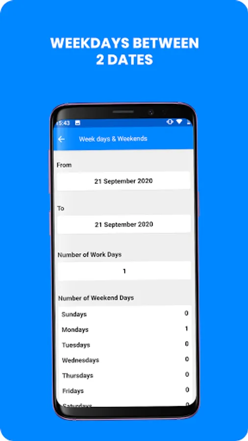 ▶Find business days between two dates: What makes this time calculator app stand out in the competition is the option to find business between two days. Find the remaining days between two dates with the option to include/exclude weekends using our unique working week calculator.