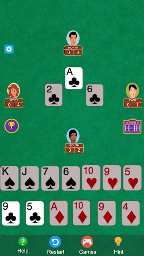 After each player completes their call, player next to dealer will make the first move, this first player can throw any card, suit thrown by this player will be the led suit and each player after him/her must follow the higher rank of same suit, if they don't have higher ranked same suit then they must follow with any card of this led suit, if they don't have this suit at all then they must break this suit by the trump card( which is Spade of any rank), if they don't have spade also then they can throw any other card. The highest card of the led suit will capture the hand, but if the led suit was broken by spade(s), then in this case highest ranked card of spade will capture the hand. The winner of a hand will leads to the next hand. In this way the round continues until the completion of 13 hands and after that next deal will begin.