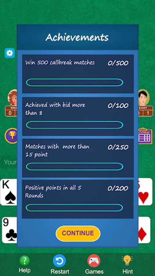 Callbreak is played with a standard deck of 52 cards among 4 players. After each deal player has to make a "Call" or "bid" for the number of hands he/she can capture, and the objective is to capture at least that many hands in the round, and try to break other player i.e. stop them from getting their Call. After each round, points will be calculated and after five rounds of play each players five rounds points will be added as a total points and player with highest total point will win.