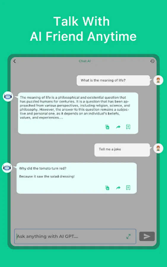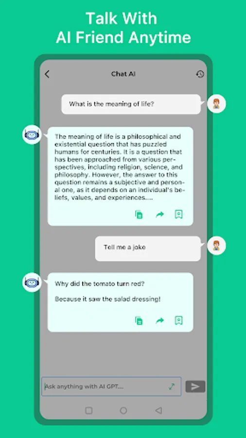 AI Friend is your personalized AI assistant designed to help you navigate life's challenges with ease. Our app is built based on OpenAI’s GPT-3 API. Please note that AI Friend works on the basis of GPT-3, not on OpenAI’s ChatGPT.