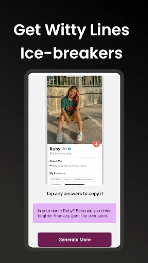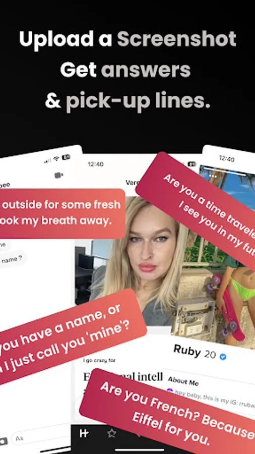 Instant RIZZ Replies: No more worrying about what to say next. Upload a screenshot of your dating app match conversation, and we'll instantly provide a creative and engaging response.