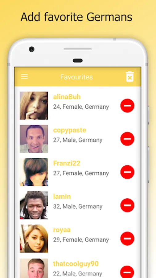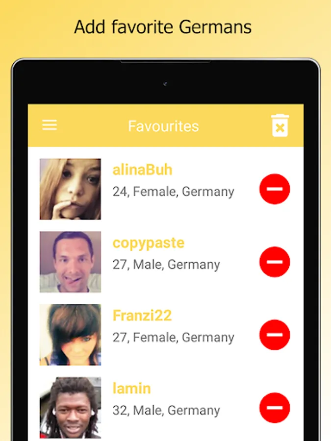 German Dating is a FREE German dating app for German, Deutsch and Berlin women and men to meet up. If you are curious and looking for new Germany friends in the Deutsch community then start a free Deutsch chat and begin a relationship. At German Dating you can instantly view German singles, Frankfurt singles and Hamburg singles and within 60 seconds register and start a free chat, flirt, hook up or hang out.