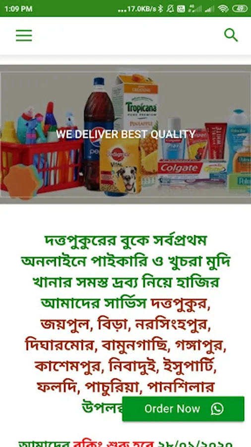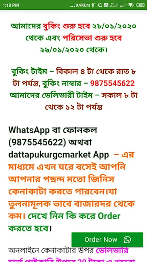 WhatsApp বা ফোনকল (9875545622) অথবা dattapukurgcmarket App – এর মাধ্যমে এখন ঘরে বসেই আপনি আপনার পছন্দ মতো জিনিস কেনাকাটা করতে পারবেন।যা তুলনামূলক ভাবে বাজারদর থেকে কম। দেখে নিন কি করে Order করতে হবে।