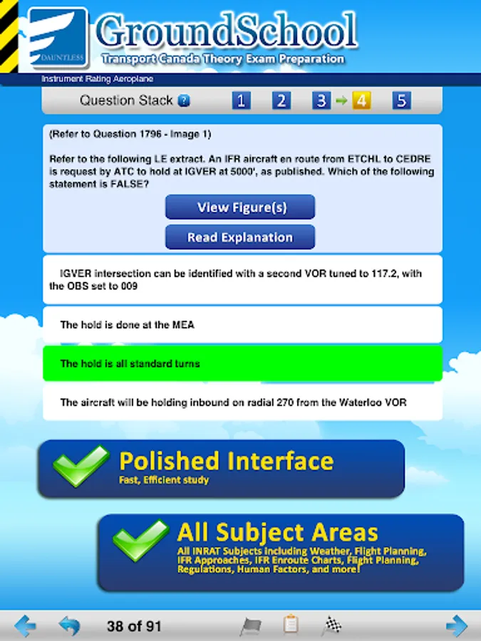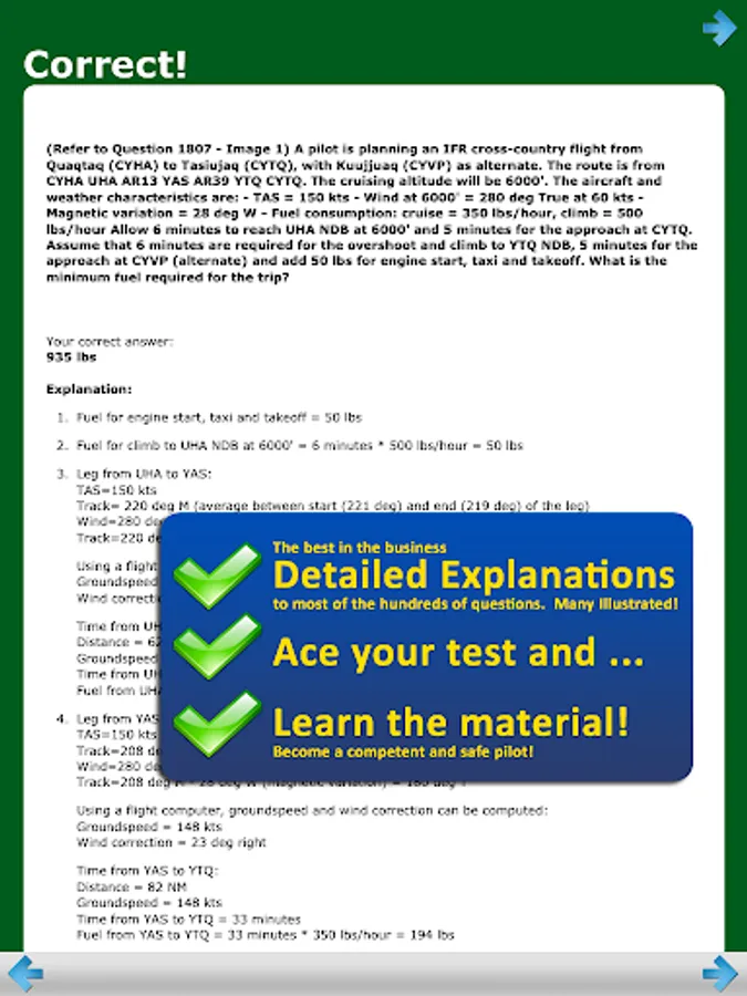 The entire test bank consists of around 1000 representative questions. All feature full explanations, many of which are illustrated. Best of all, you can be sure that the questions are current and representative, as not only do we have a professional and experienced team of CFI and Professional Pilot authors and editors overseeing our test prep content, but also updates are integrated and free. That’s right; updates are built-into the app such that you can with one click get access to the latest and greatest sample questions that our editors have made available.