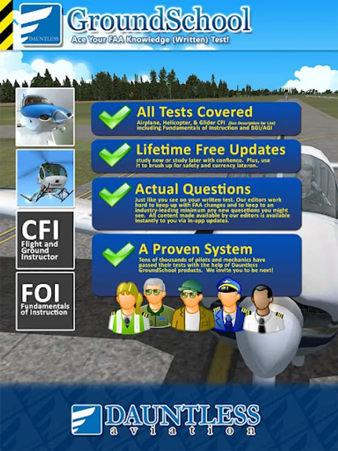 Spend less time studying and more time flying! This is the FAA Flight and Ground Instructor (CFI) version of GroundSchool, our FAA knowledge (written) test preparation featuring up-to-date questions, free updates, and illustrated explanations written by a professional team of pilot examiners and instructors.