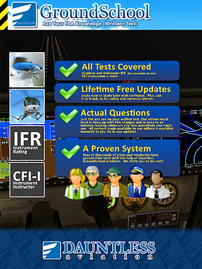 Study actual, up-to-date FAA questions and then ACE your FAA Instrument Rating (and/or Instrument Ground/Flight Instructor) knowledge (written) test the easy way with GroundSchool FAA Knowledge Test Preparation software by Dauntless Aviation, the trusted leader in FAA written test preparation.