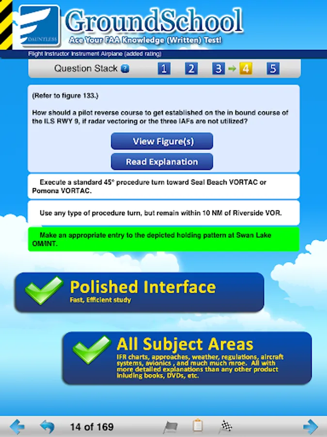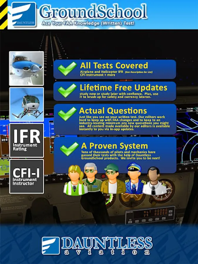 Spend less time studying and more time flying! This is the FAA Instrument Rating (IFR) version of GroundSchool, our FAA knowledge (written) test preparation featuring up-to-date questions, free updates, and illustrated explanations written by a professional team of pilot examiners and instructors.